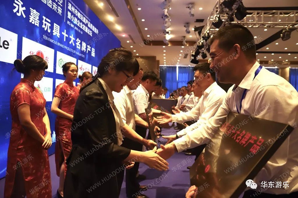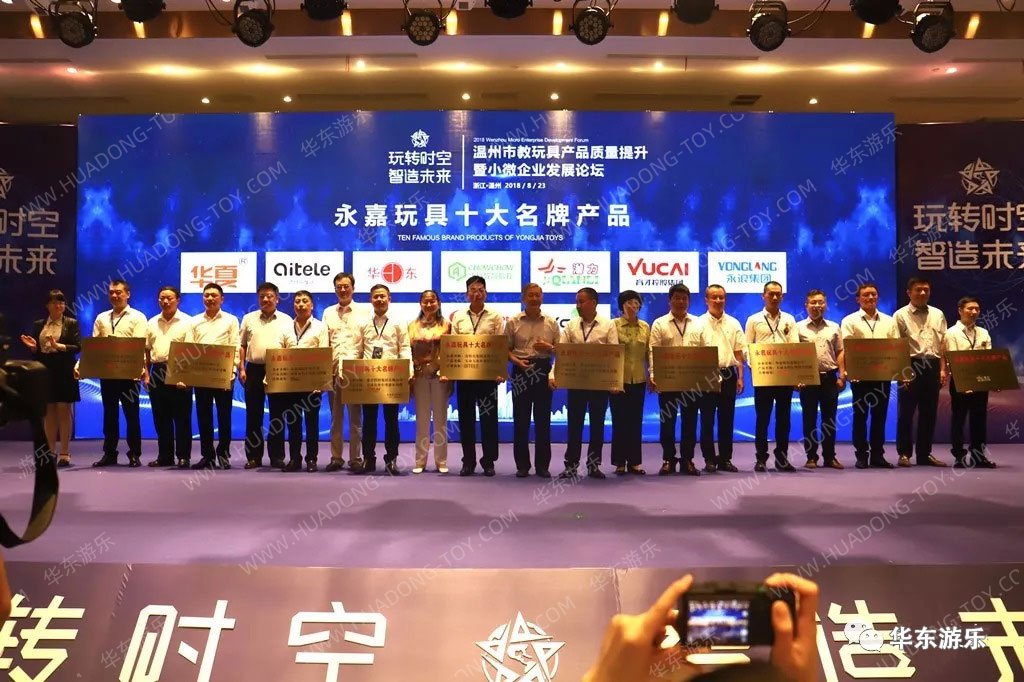首届“永嘉玩具十大名牌产品”评选结果也在论坛上正式揭晓。奇特乐集团有限公司、育才控股集团有限公司、凯奇集团有限公司、永浪集团有限公司、浙江巧巧教育科技有限公司、立本集团有限公司、华夏游乐有限公司、金沙990游乐设备有限公司制造的无动力类小型游乐设施产品以及贝旺玩具有限公司、浙江潜力玩具有限公司制造的塑胶玩具产品被评为“永嘉玩具十大名牌产品”。