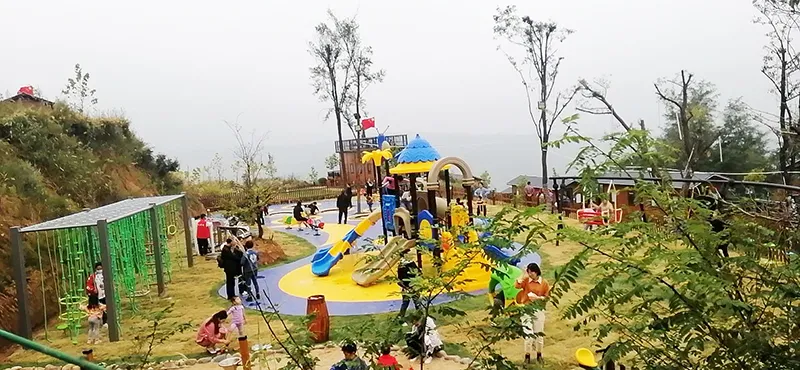 甘山晟境儿童休闲区选用了金沙990游乐生产的跨国欢乐岛滑梯、动物系列滑梯、攀爬墙‘爬网、摇摇乐、旋转转椅、音乐版等游乐设备,给小朋友提供了休闲、玩耍的场所。