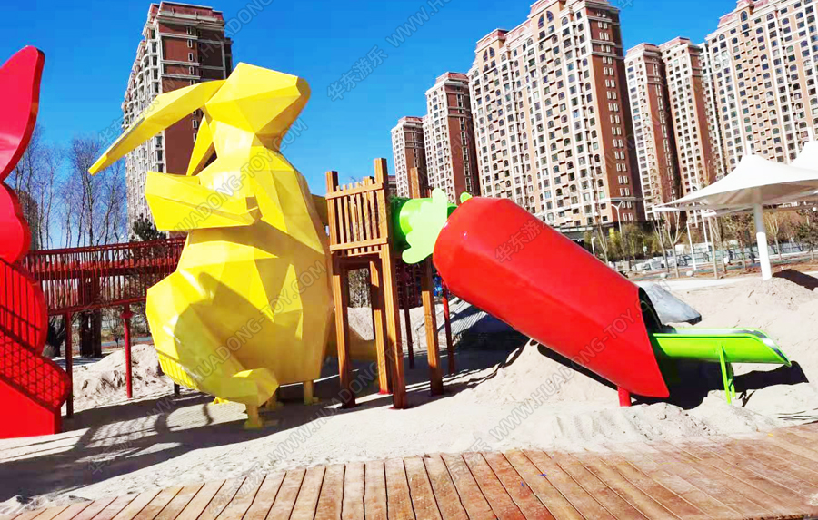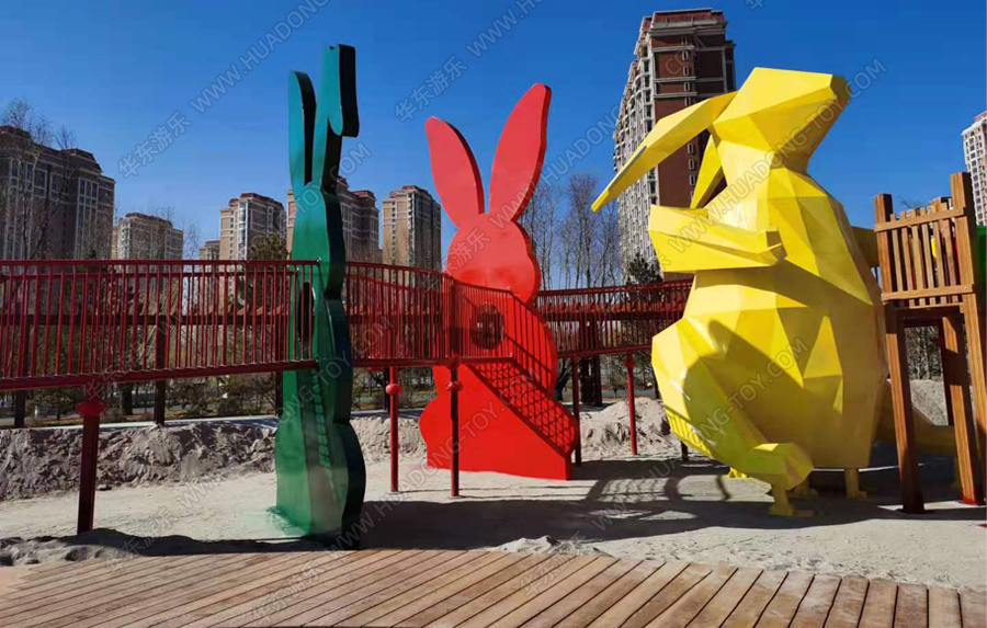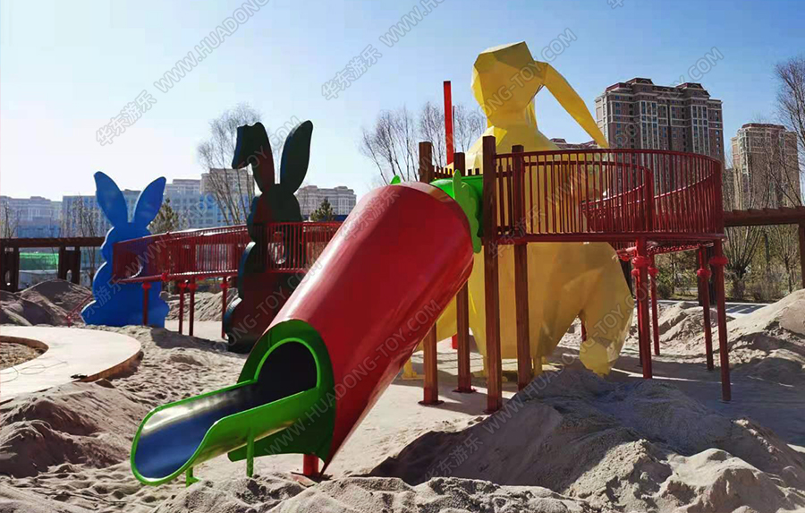 兔子乐园非标定制是金沙990游乐根据客户场地需求以及结合当地实际情况而设计的兔子主题乐园的游乐场,该游乐园具有主题鲜明,设计新颖,功能多样等特点,设计了滑梯组合、爬网、钻洞、沙池等游乐设备。