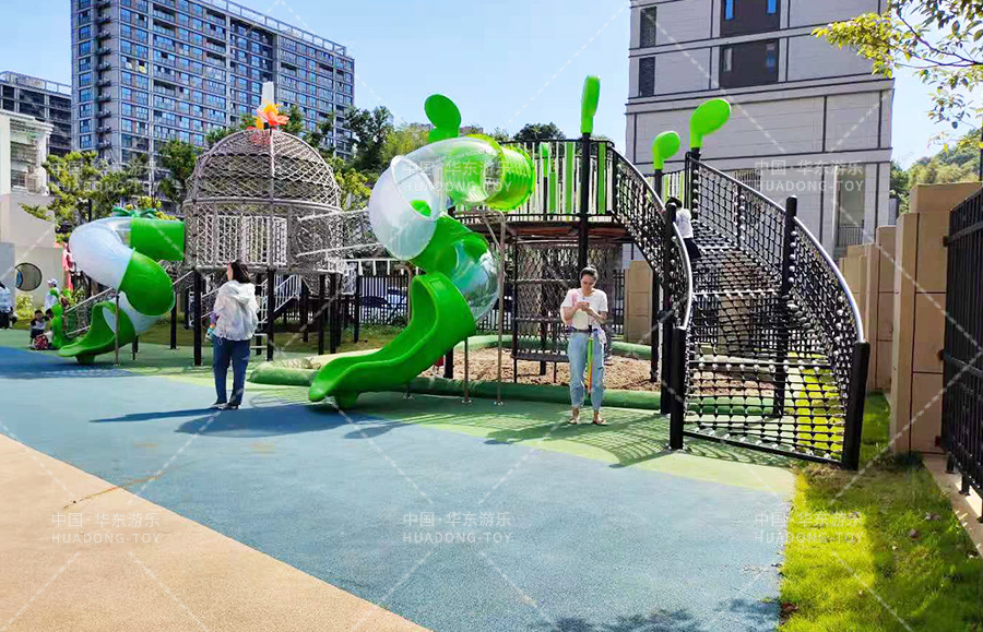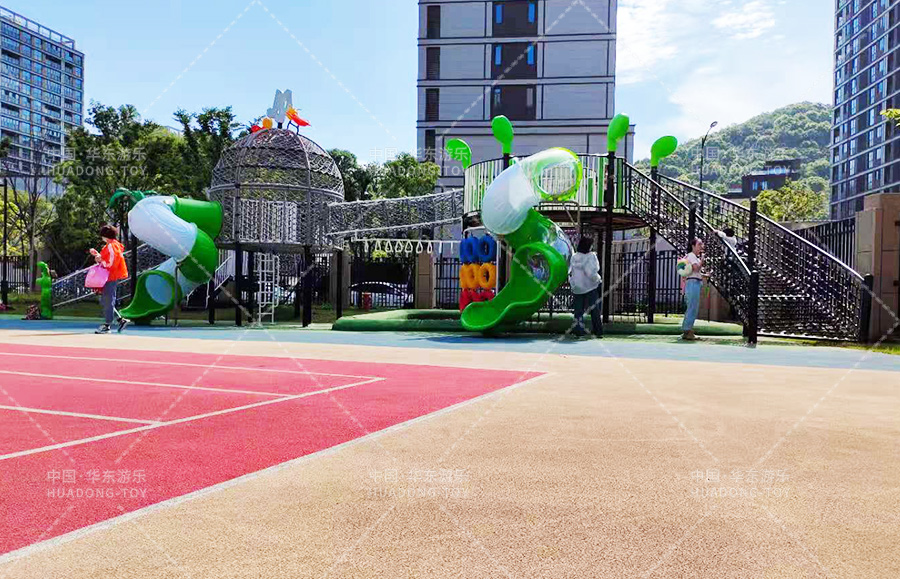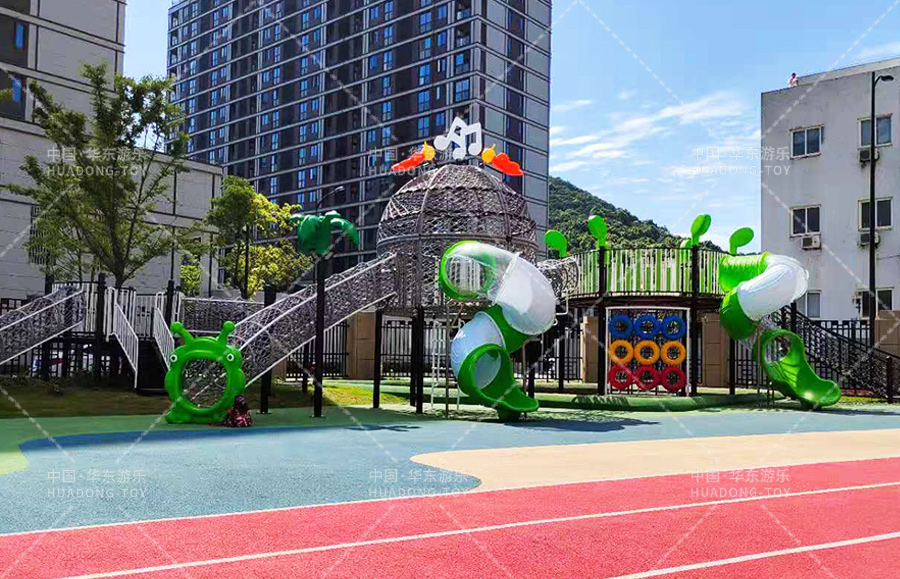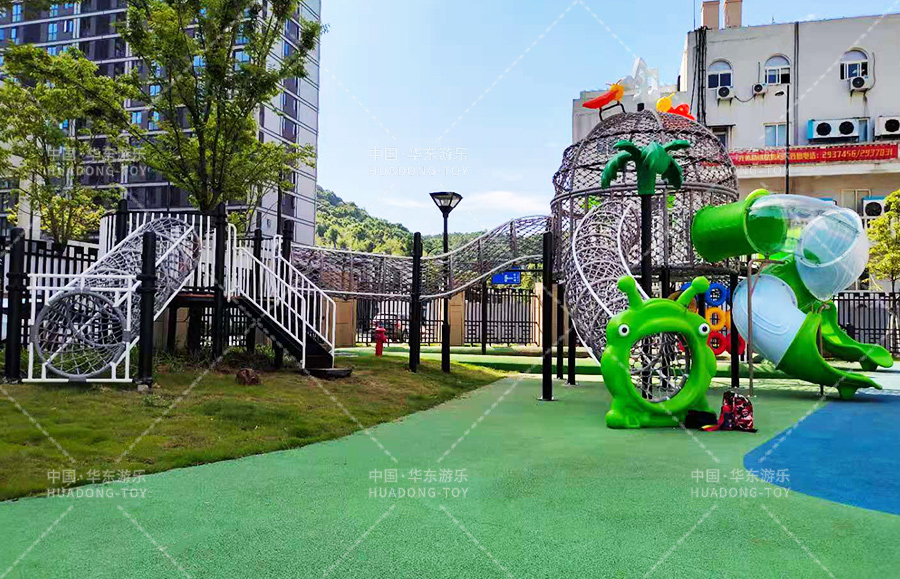 舟山市畚斗岙幼儿园此次选用的是又金沙990游乐自主研发和设计的网绳系列户外滑梯组合,具备了爬网、钻洞、滑梯、滑桶、吊环、攀爬梯、沙池等游乐设备,能够让小朋友在玩耍中得到很好的锻炼和学习。