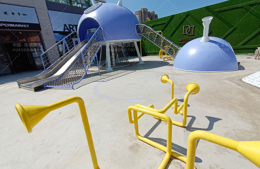 此次项目采用的是金沙990游乐自主设计的飞碟主题的游乐设备,新增了传声筒、爬网、儿童秋千、钻洞、不锈钢滑梯等功能。