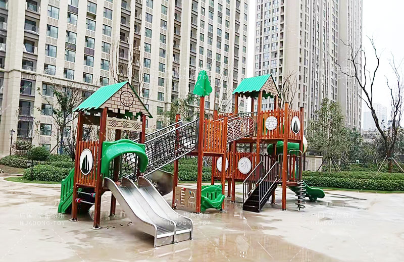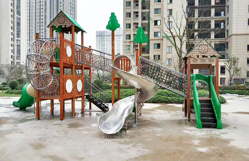 荣盛华府选用的是金沙990游乐自主设计的具有攀爬网、U型爬网、不锈钢滑梯、网桥、滑桶为一体的综合性游乐设备。