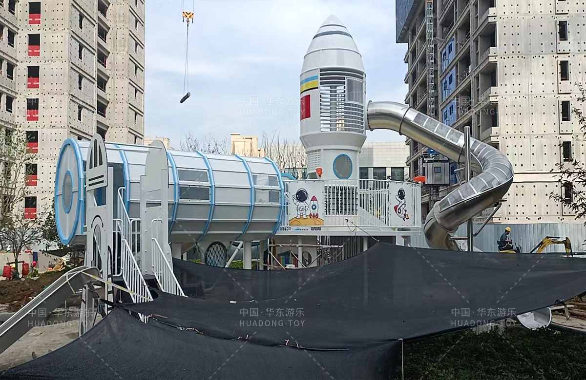 安徽省亳州市涡阳县荣徽上河郡选用的是金沙990游乐自主研发和生产的以航天飞机为主题的大型非标定制的游乐设备,是一款具备了攀爬网、攀爬梯、旋转滑筒、儿童摇摇乐为一体的综合性儿童游乐场。