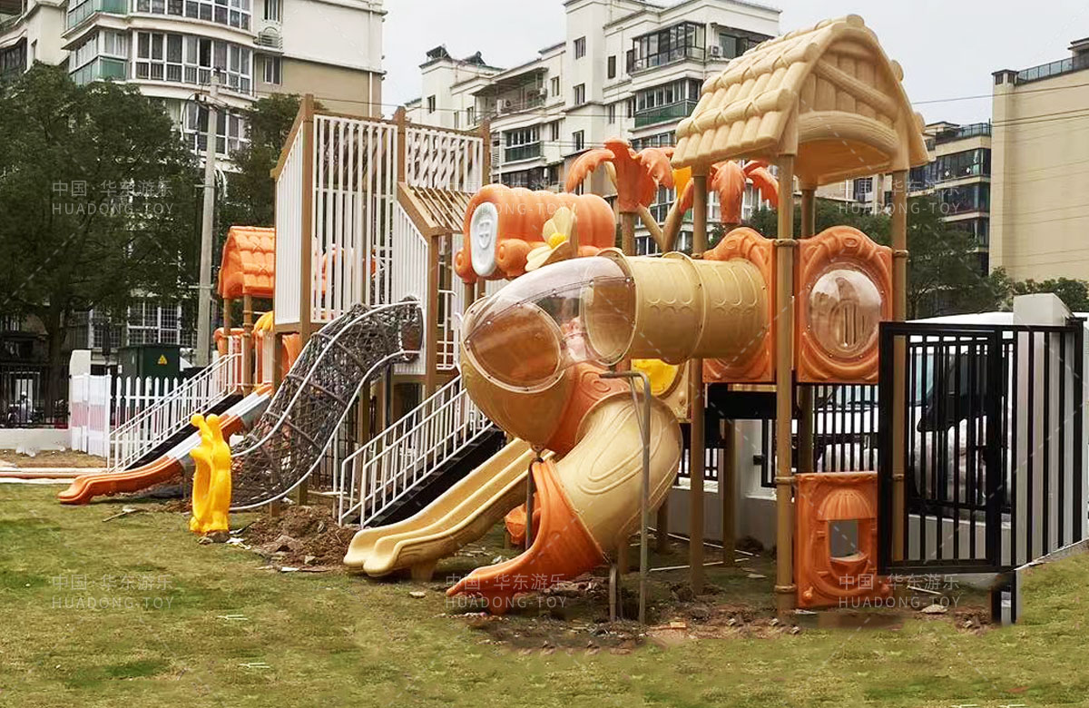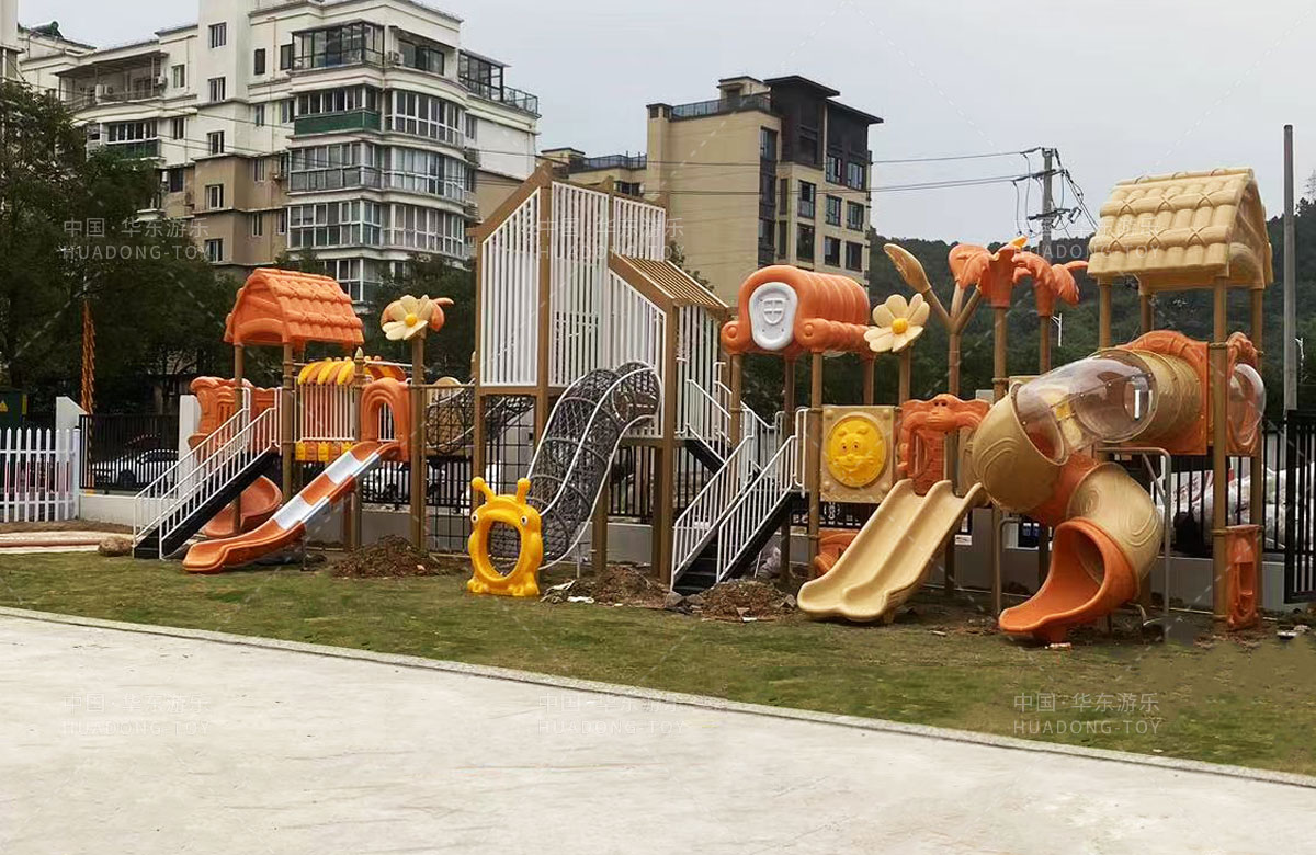 永嘉县童真幼儿园是一家专业的学前培训学校,此次选用的儿童游乐设备是金沙990游乐自主研发和设计的大型户外组合滑梯,该滑梯是一款具备了攀爬网、大型滑筒、旋转滑梯、直行走梯、双人滑梯等功能为一体的综合性游乐设备。