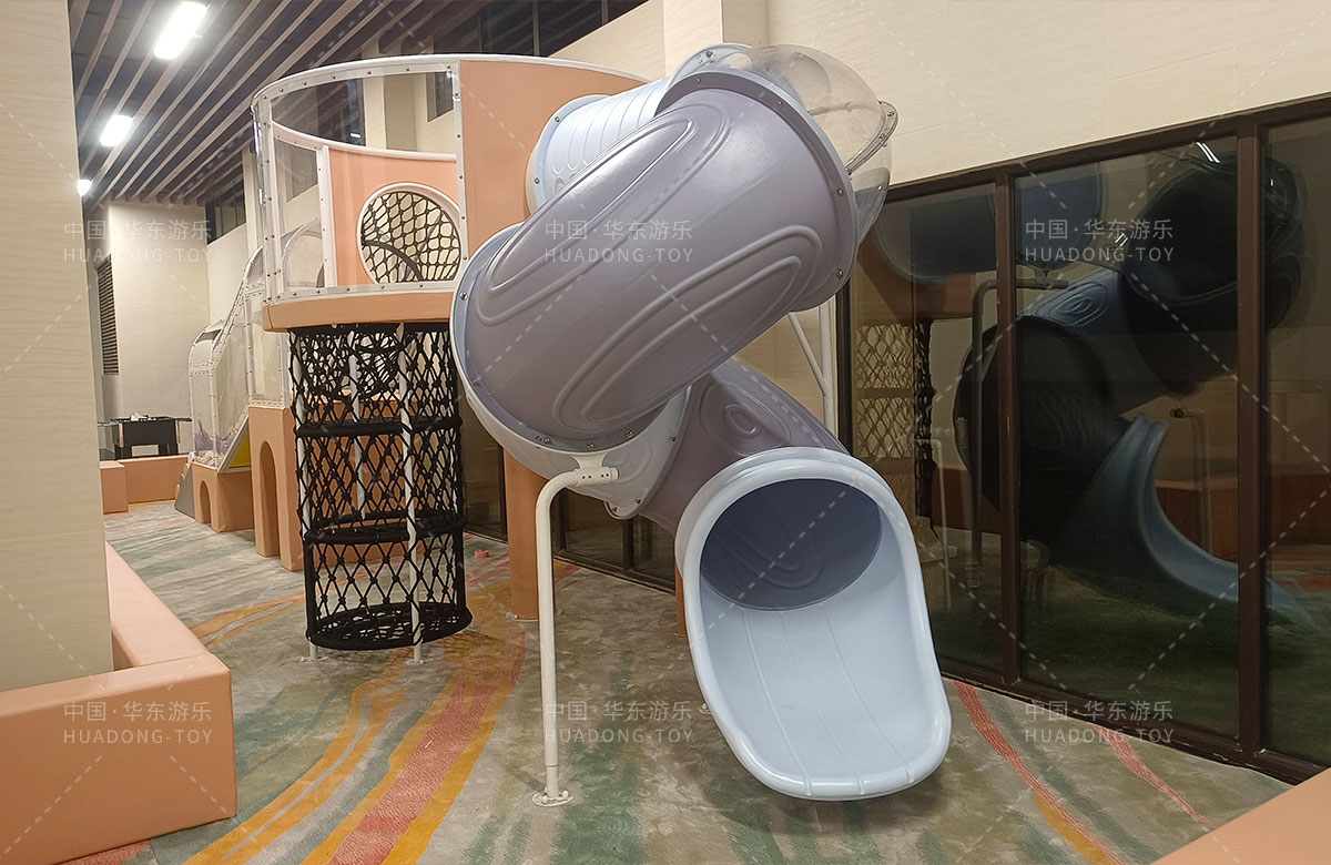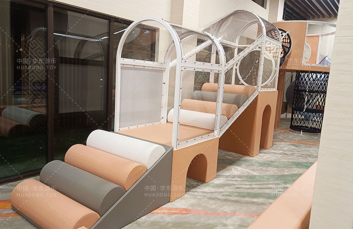 该项目选用的是金沙990游乐生产的室内淘气堡系列产品,整套设备集合了攀爬网、钻洞、攀爬梯、旋转滑筒等功能,除此之外还设置了小朋友们喜欢的毛毛虫钻洞,儿童台球、乒乓球、桌面足球等设备,让整个售楼处变得更加的充满生机与活力。
