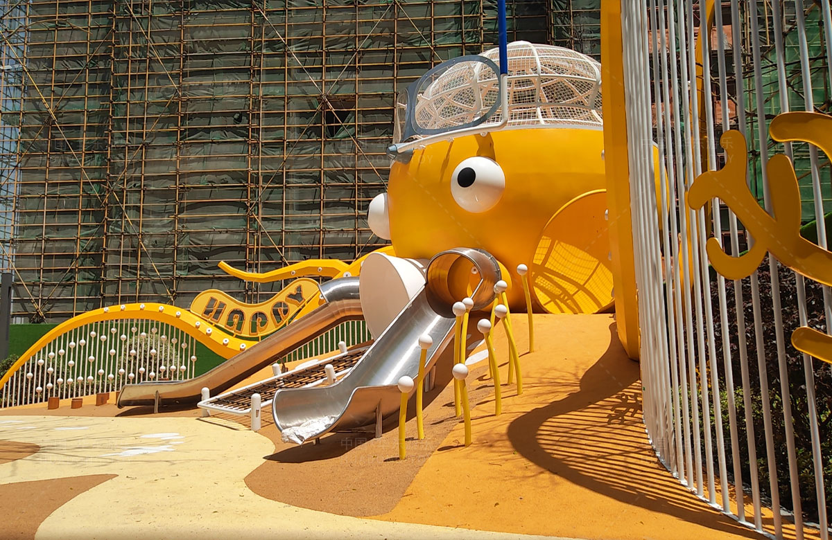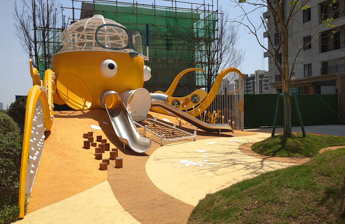 襄阳金辉优步学府此次选用的是金沙990游乐自主研发和设计的以章鱼为主题的的游乐设备,该设备以生动的形象向小朋友展示了游乐设备的多姿多彩,结合各种的攀爬网、攀爬梯、不锈钢滑梯、攀爬杆、不锈钢钻洞、组合秋千,不仅仅丰富了小区的生活,同时也为生活在当地的人群提供了一个休闲、娱乐、遛娃的场所。