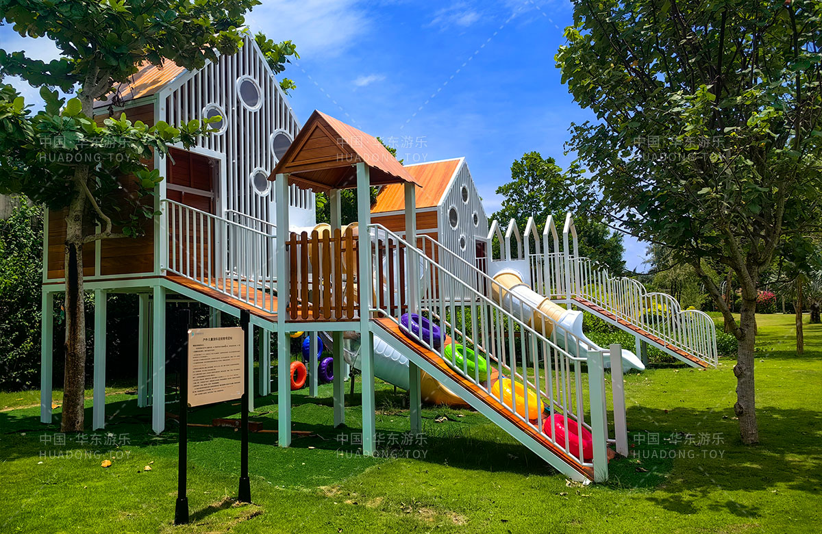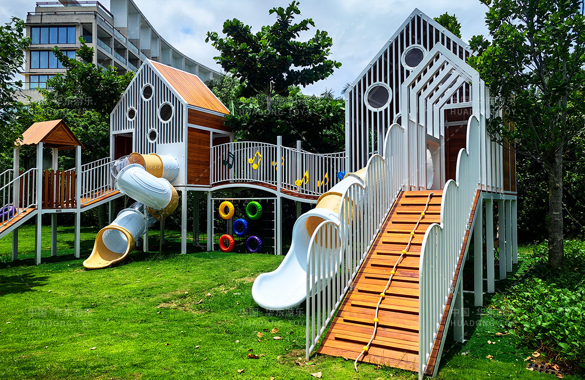 三亚天涯蓝海度假酒店是一个高端的休闲、旅游度假酒店,为了更好的为各位客户提供更加高端和更加完美的旅行服务,该酒店选用了金沙990游乐自主研发和设计的非标定制的多功能组合游乐设备,该设备具备了攀爬绳、攀爬网、旋转滑梯、游戏小屋等系列功能。
