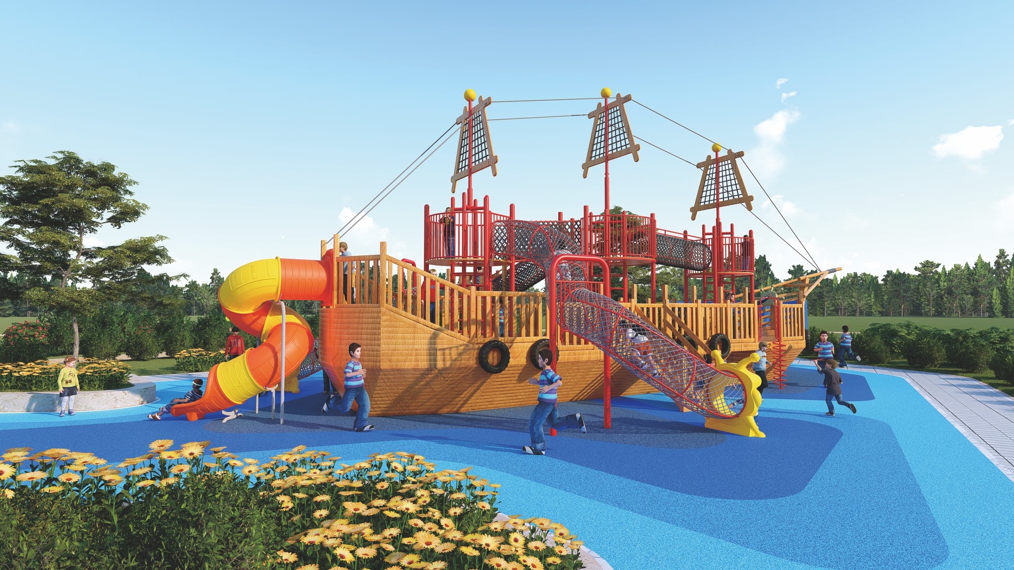 木质海盗船组合滑梯的设计以大自然为主题,融合了船体、桅杆、甲板等元素,外观新颖、结构牢固。它集攀爬、滑梯、秋千等功能于一体,旨在锻炼孩子的平衡协调能力和自我保护意识,同时培养探险精神。